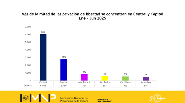 Los primeros registros, correspondientes al semestre enero-junio de 2025, muestran que la mayor concentración de casos se produjo en los departamentos Central y Asunción, con 1.843 y 1.275 personas aprehendidas o detenidas, respectivamente.